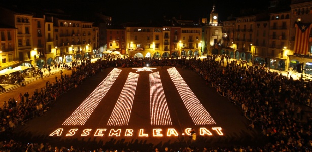 Milhares de velas formam o desenho da bandeira catalã na cidade de Vic, na Catalunha. A crise econômica da Espanha é apontada como a causa do fortalecimento de movimentos separatistas da região