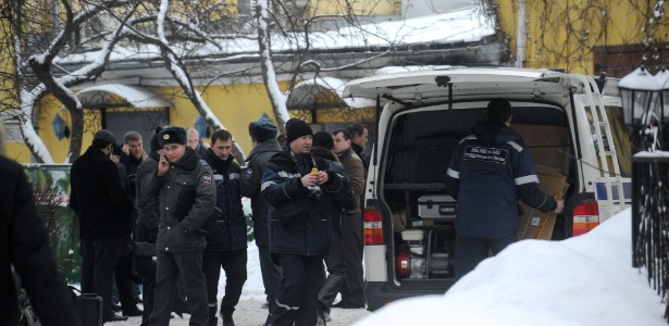 16.jan.2013 - Policiais e investigadores se reúnem fora de um restaurante no centro de Moscou, na Rússia, local onde Aslan Usoyan, o líder da máfia russa, também conhecido como "Ded Hassan" (Avô Hassan) foi assassinado, nesta quarta-feira (16)