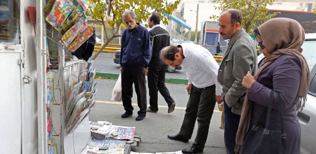 - Iranianos observam jornais no chão ao lado de uma banca em Teerã. A