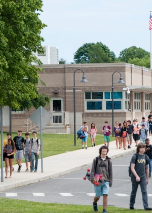 Estudantes deixam escola East Hampton High School, em East Hampton, Nova York (EUA)