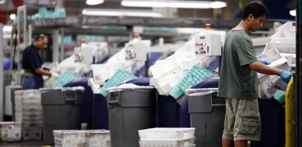 Homens trabalham no Centro de Processamento e Distribuição do Serviço Postal