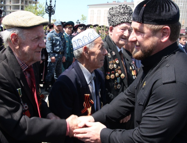 líder checheno Ramzan Kadyrov (dir.) cumprimenta veteranos da 2ª Guerra