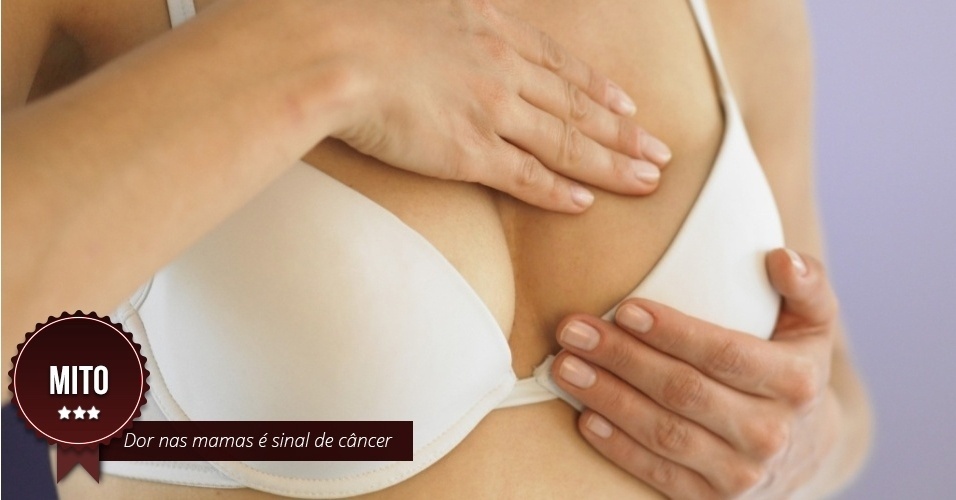 Dor nas mamas é sinal de câncer. MITO - O principal sintoma é o nódulo (caroço) que aparece nas mamas, que pode ou não ser acompanhado de dor. Além disso, podem surgir alterações na pele que recobre a mama, como abaulamentos ou retrações, inclusive no mamilo, ou aspecto enrugado semelhante à casca de laranja, e até mesmo secreção no mamilo. Mas, na maioria dos casos, a dor nas mamas é apenas sinal de alterações benignas causadas pelas oscilações hormonais - Arte UOL/Thinkstock