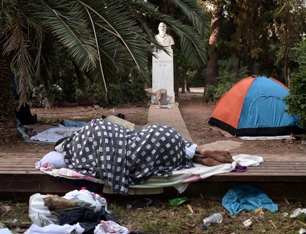 Imigrantes dormem ao ar livre no centro de Atenas, em local de abrigo temporário