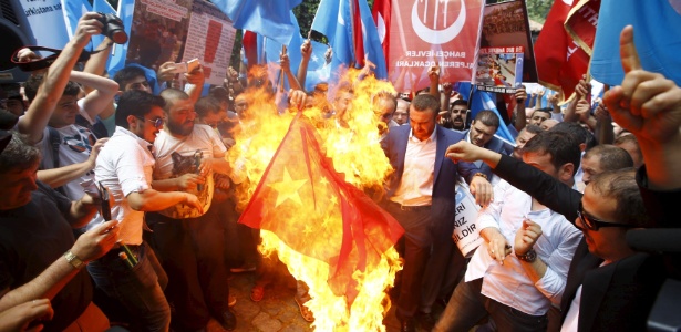 Manifestantes queimam a bandeira da China durante protesto contra o país asiático nas proximidades do consulado chinês em Istambul, na Turquia, no início de julho
