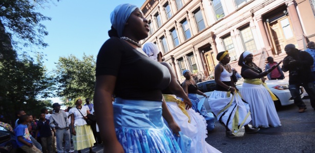 Dançarinos se apresentam no dia africano em um festival no Harlem, em Nova York (EUA)As pessoas ainda conversavam quando Afua Atta-Mensah pegou o microfone e deu as boas-vindas a todos à Reunião Comunitária Africana, realizada no portão do Museu de Artes do Brooklyn neste mês.
