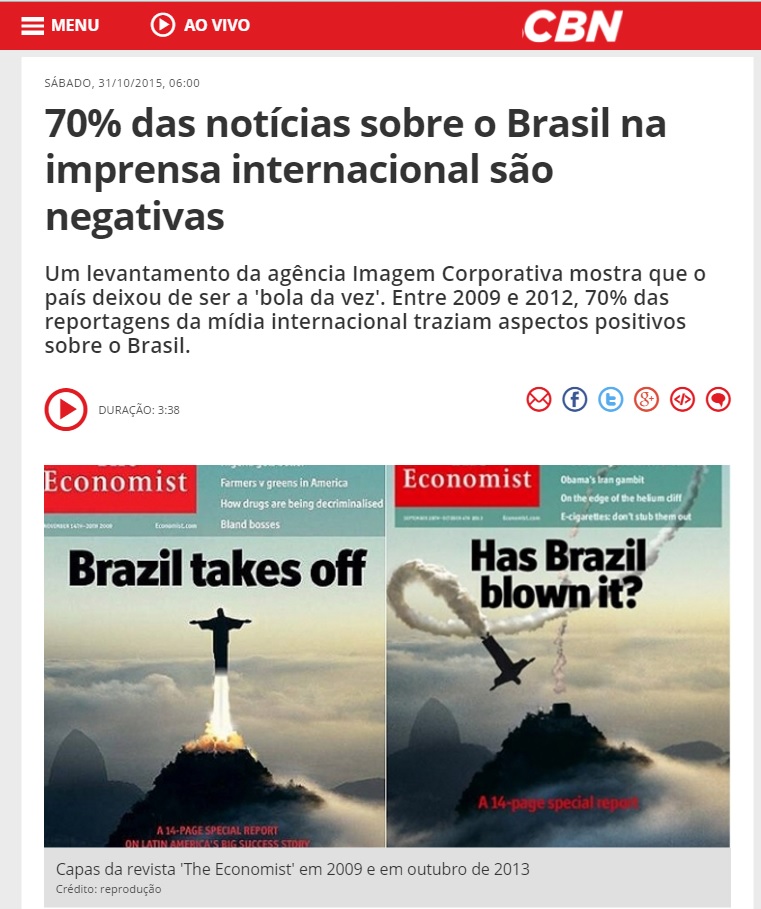 Brasil na imprensa internacional são negativas atualmente.A reportagem cita o diretor da agência que faz o estudo, Ciro Dias dos Reis. Para ele, as pessoas estão chocadas com a mudança radical no patamar do país em tão pouco tempo. “Você sendo brasileiro, as pessoas te perguntam. Quando estive na Itália, todos me questionavam a mesma coisa: ‘o que aconteceu com o Brasil’? Em três anos, mudou tudo.''