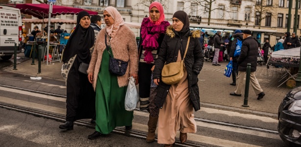 Moradoras passeiam pelo mercado de Molenbeek, em Bruxelas